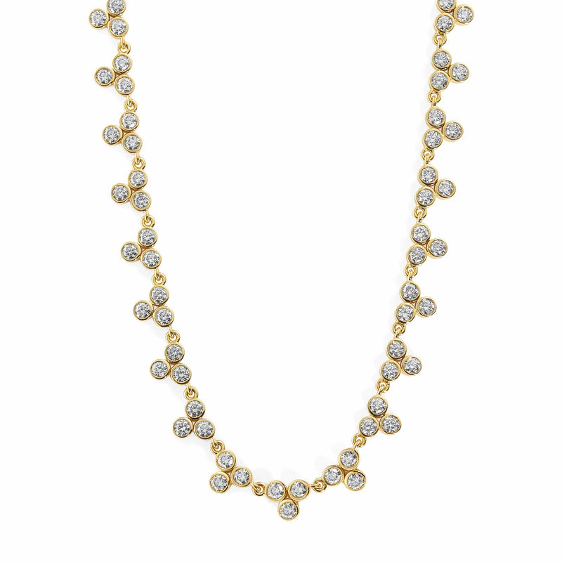 This essential diamond necklace needs to find its way into your jewelry wardrobe. Crafted in 18K yellow gold, it features delicate clusters of bezel-set diamonds.