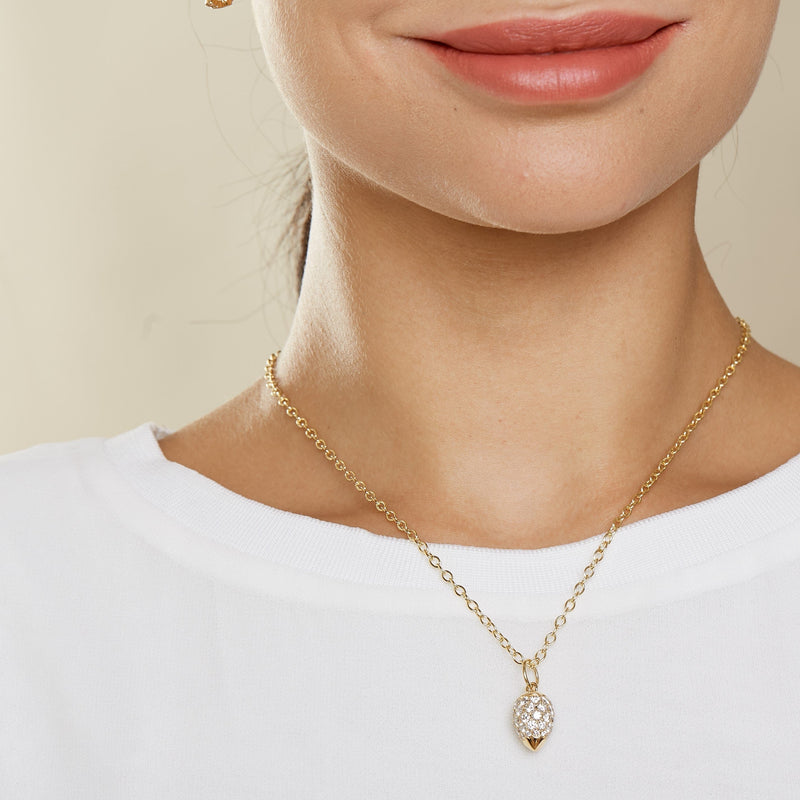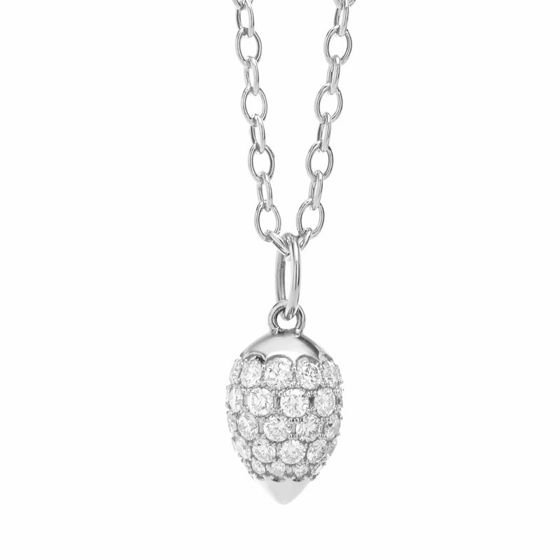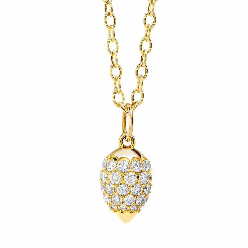 Inspired by motifs in ancient Mughal ornamentation, this sophisticated and elegant drop pendant with its teardrop shape has a polished 18K gold point and a surface of sparkling diamonds. The silhouette is timeless and will endure for many years to come.