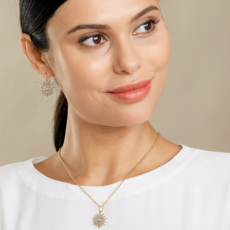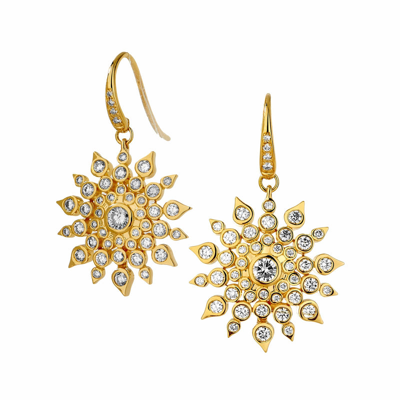 Resembling awe-inspiring starbursts in outer space, these playful statement earrings feature an array of sparkling diamonds in varying sizes. An 18K gold frame amplifies the shine of the diamonds and brings warmth and magic to the face.