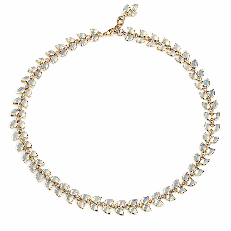 Graceful and glowing, this handcrafted necklace features luminous moon quartz cabochons nestled among delicate diamond-accented vines. Set in 18K yellow gold, it’s a poetic expression of natural beauty and refined elegance.